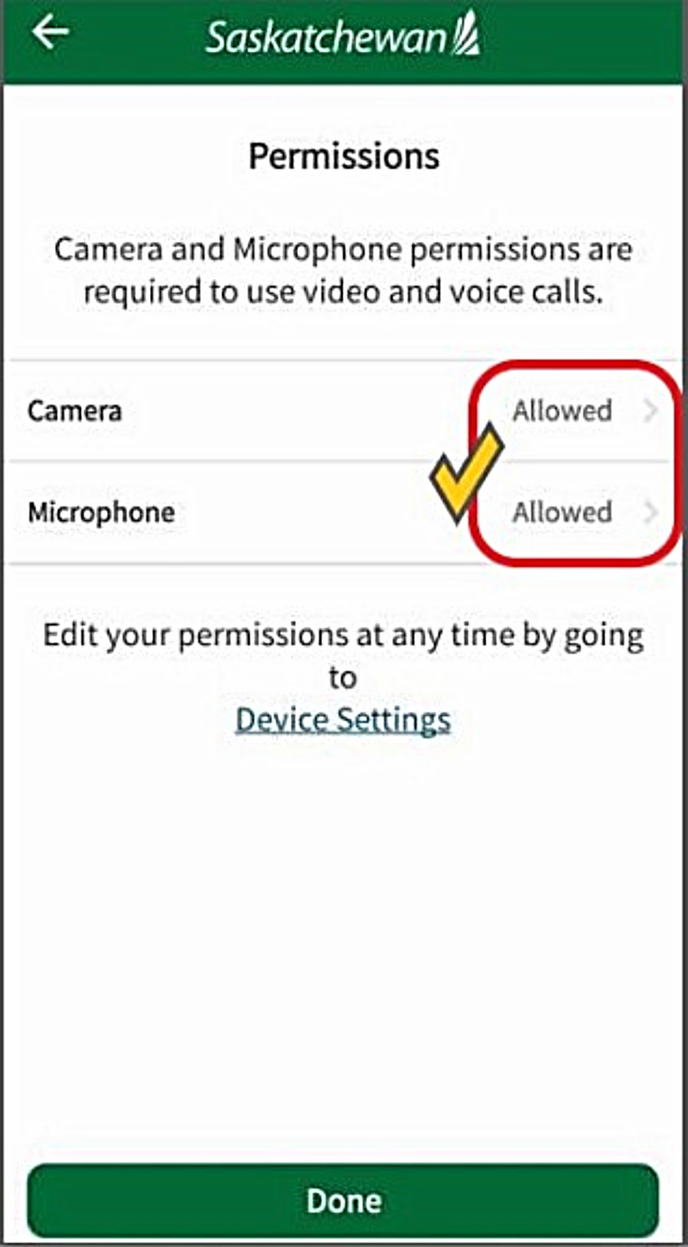 If the ‘Permissions’ screen says ‘Allowed’, click 'Done', then 'Start Test'.