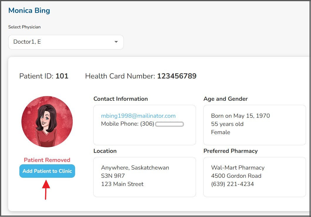 On the Patient Information screen, click 'Add Patient to Clinic'.