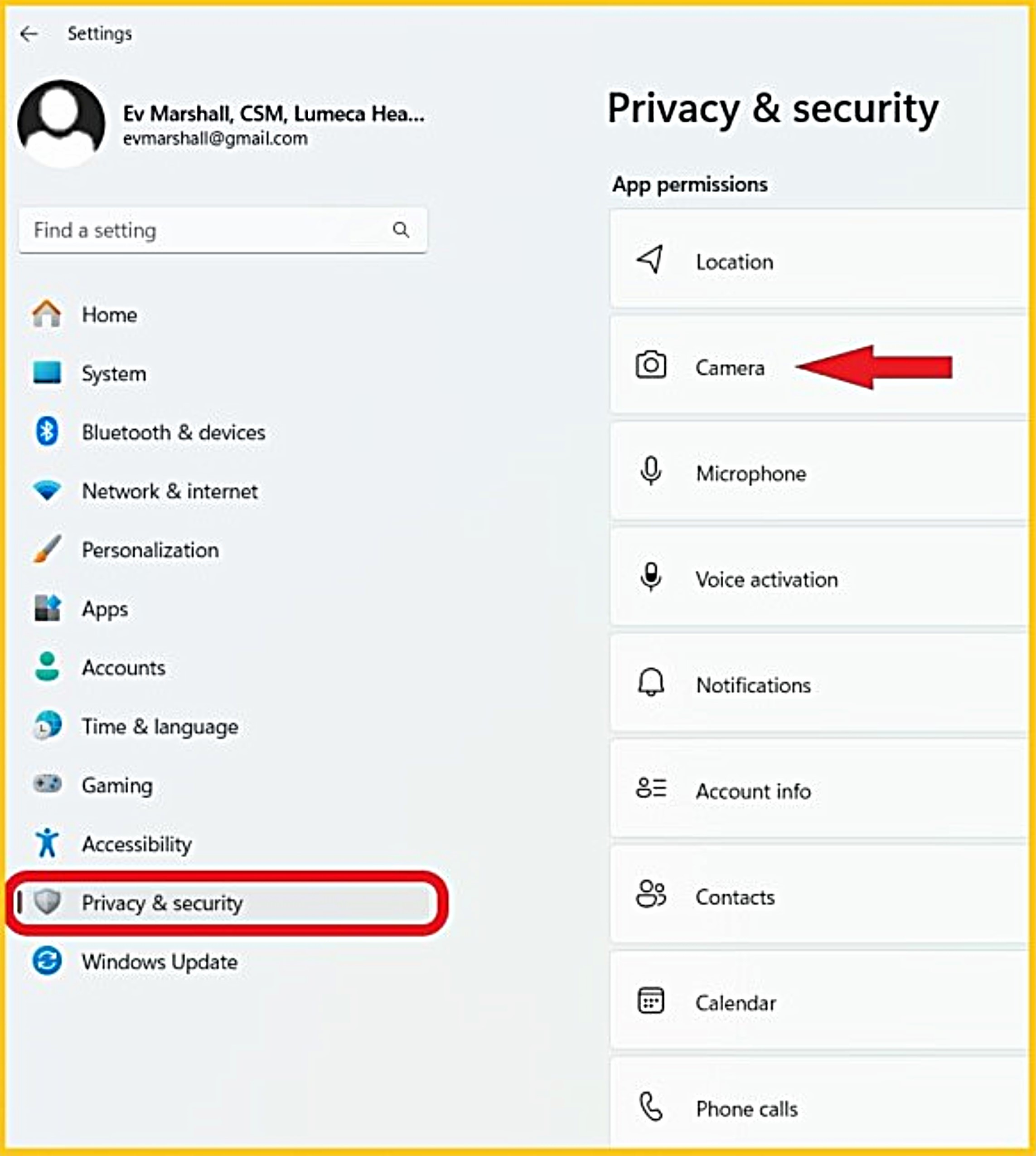 Under 'Privacy & security' (Windows 11) or 'Privacy' (Windows 10), find and select 'Camera'.