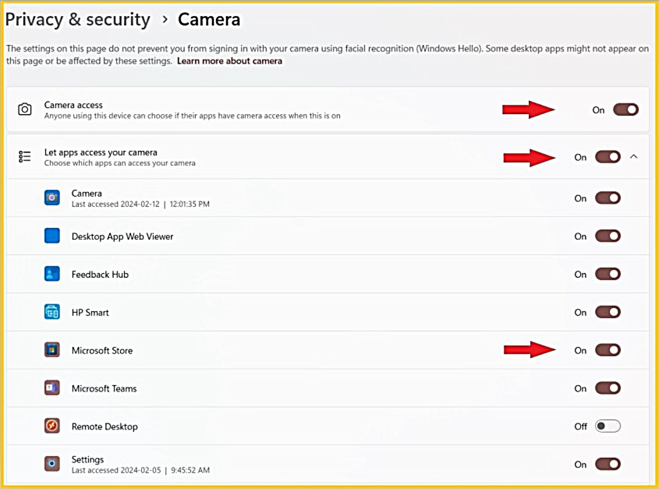 Windows 11 - Make sure 'Camera Access' & 'Let apps access your camera' are turned 'On'.