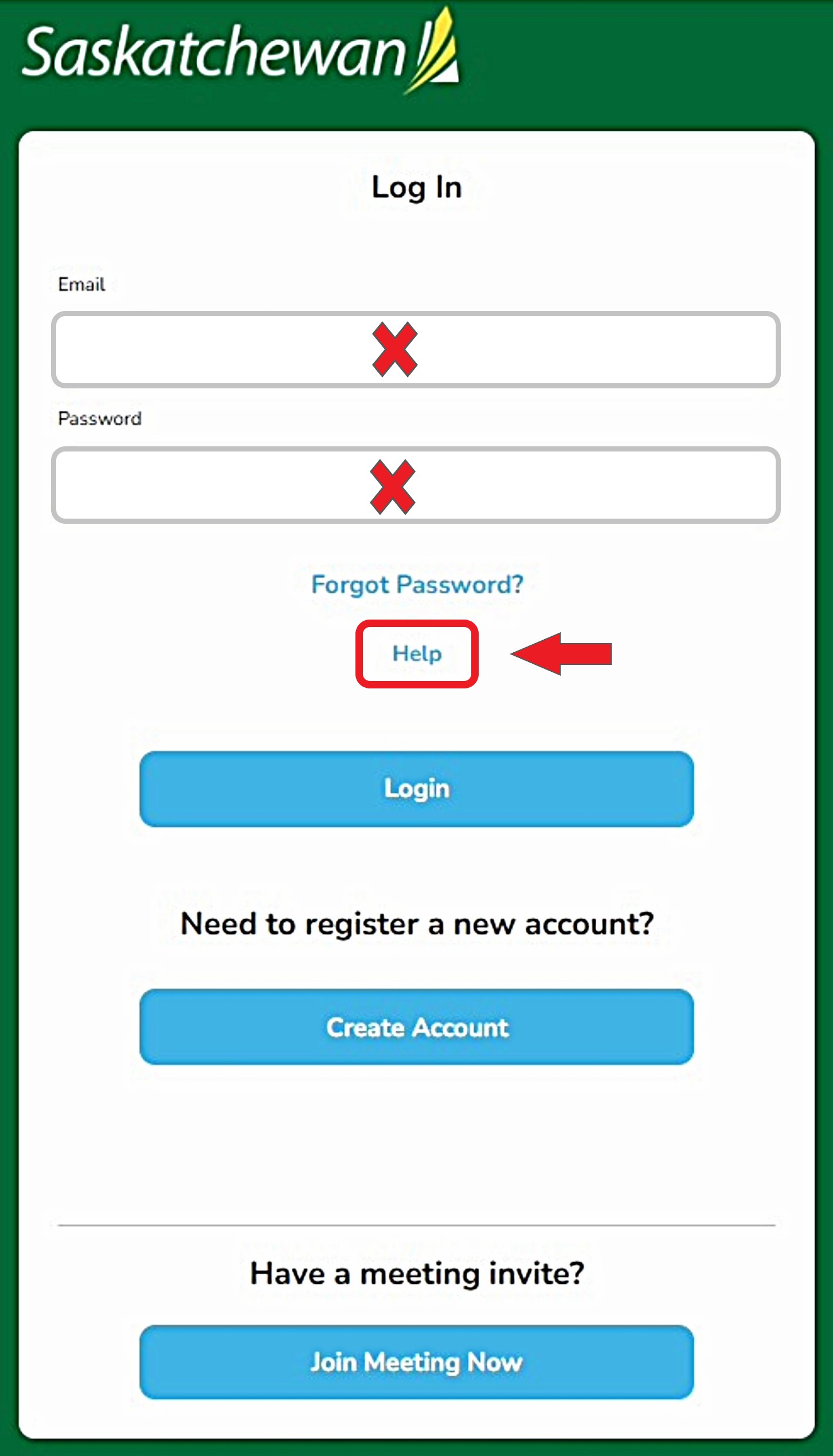 Step 1 - Click 'Help' on the 'Log In' screen (at https://virtualvisit.saskatchewan.ca/).