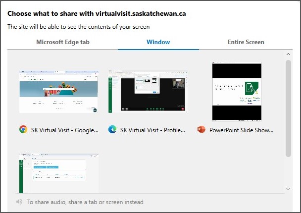 Opens the window you wish to share, however if you switch to another window, it will change to the new window you switched to. Use this option if sharing more than one window during your video call. Presentations or photos shared from your device and not open on your web browser will not change. |