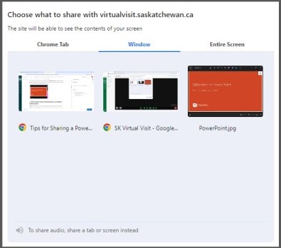 Note: If the screen that you are wanting to share has audio, you will NOT be able to use this option and will have to open it in your web browser, and select it from the "Chrome Tab" option.