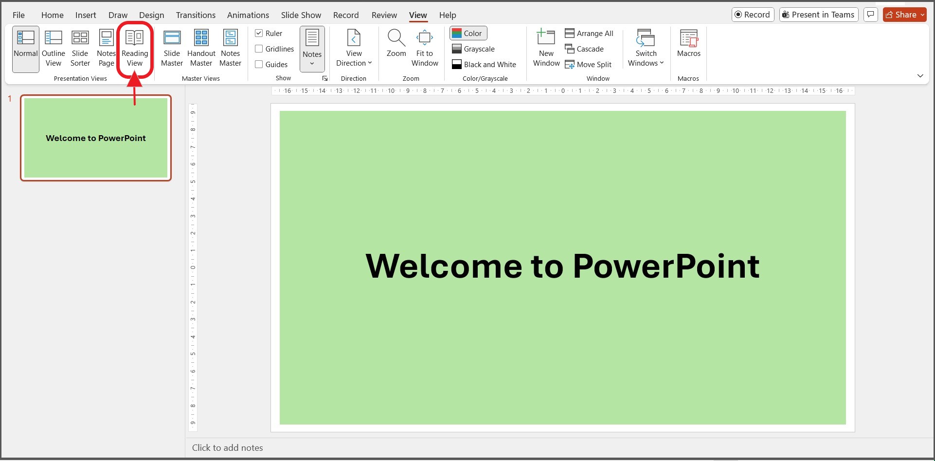 Step 2: In the PowerPoint, click 'View' in the toolbar, then 'Reading View' in the menu that appears - see below.