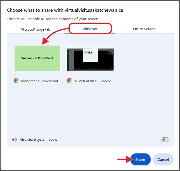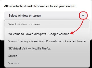While sharing a PowerPoint presentation during a SK Virtual Visit meeting, you may want to view and manipulate your PowerPoint while simultaneously seeing the video meeting participants and shared content.