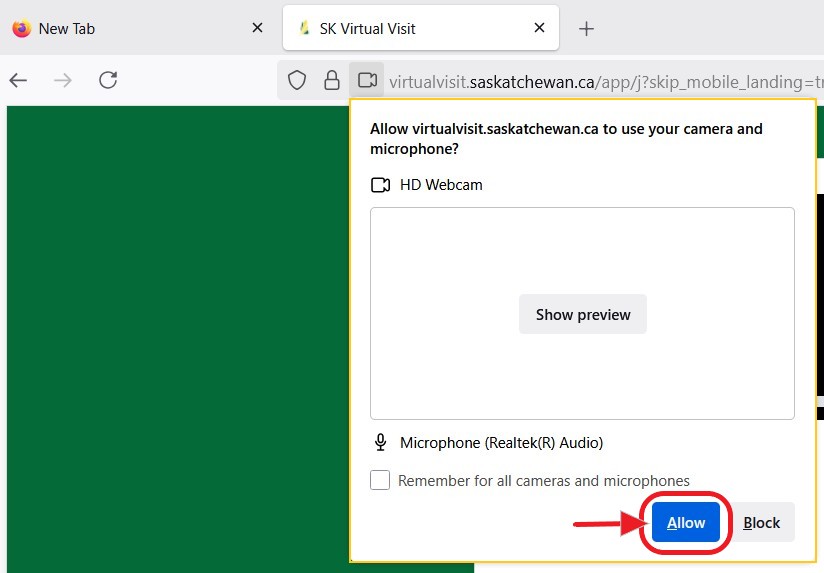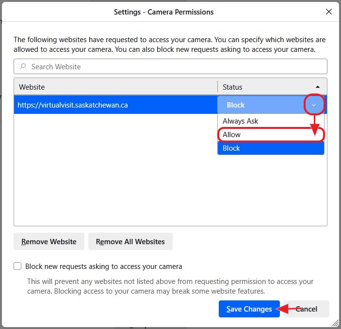 - If the status of https://virtualvisit.saskatchewan.ca says 'Block' (as shown below), click onto the word 'Block' and select 'Allow', then 'Save Changes'.
