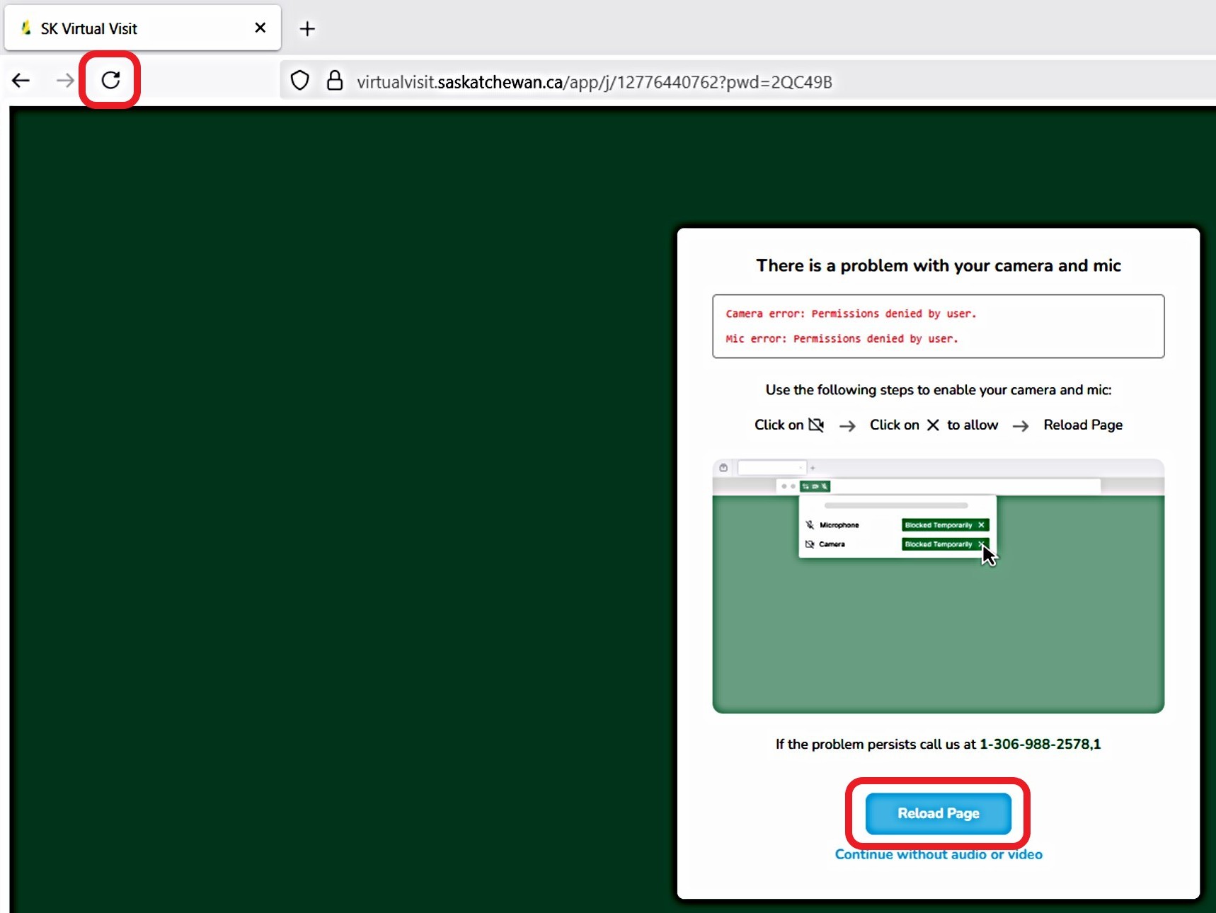 - You may have to reload or refresh the page by clicking onto one of these highlighted buttons, then 'Allow' your camera and microphone, if prompted.
