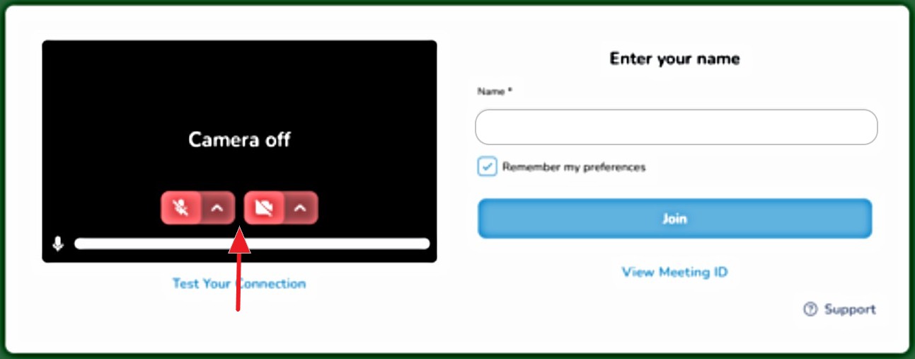 - You will be directed to the 'Join a Meeting' screen. If the microphone and camera are blocked on the video screen, turn them both 'ON'.