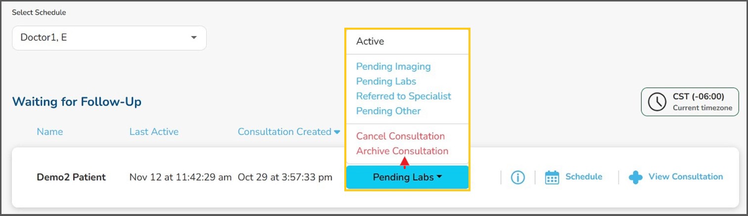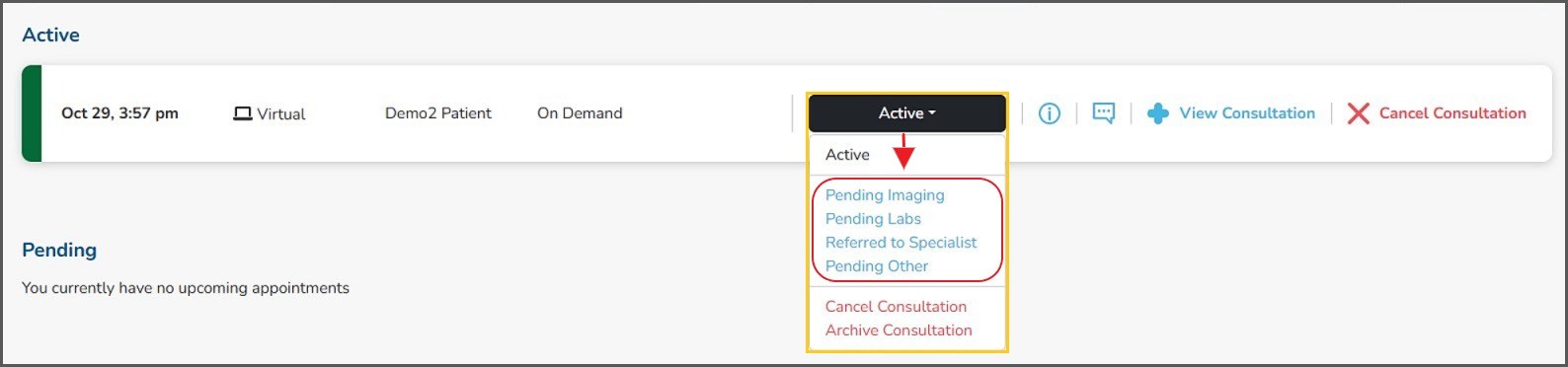 - The host or their office admin, working on their behalf, may change the status of an 'active' consultation to reflect the necessary follow-up.