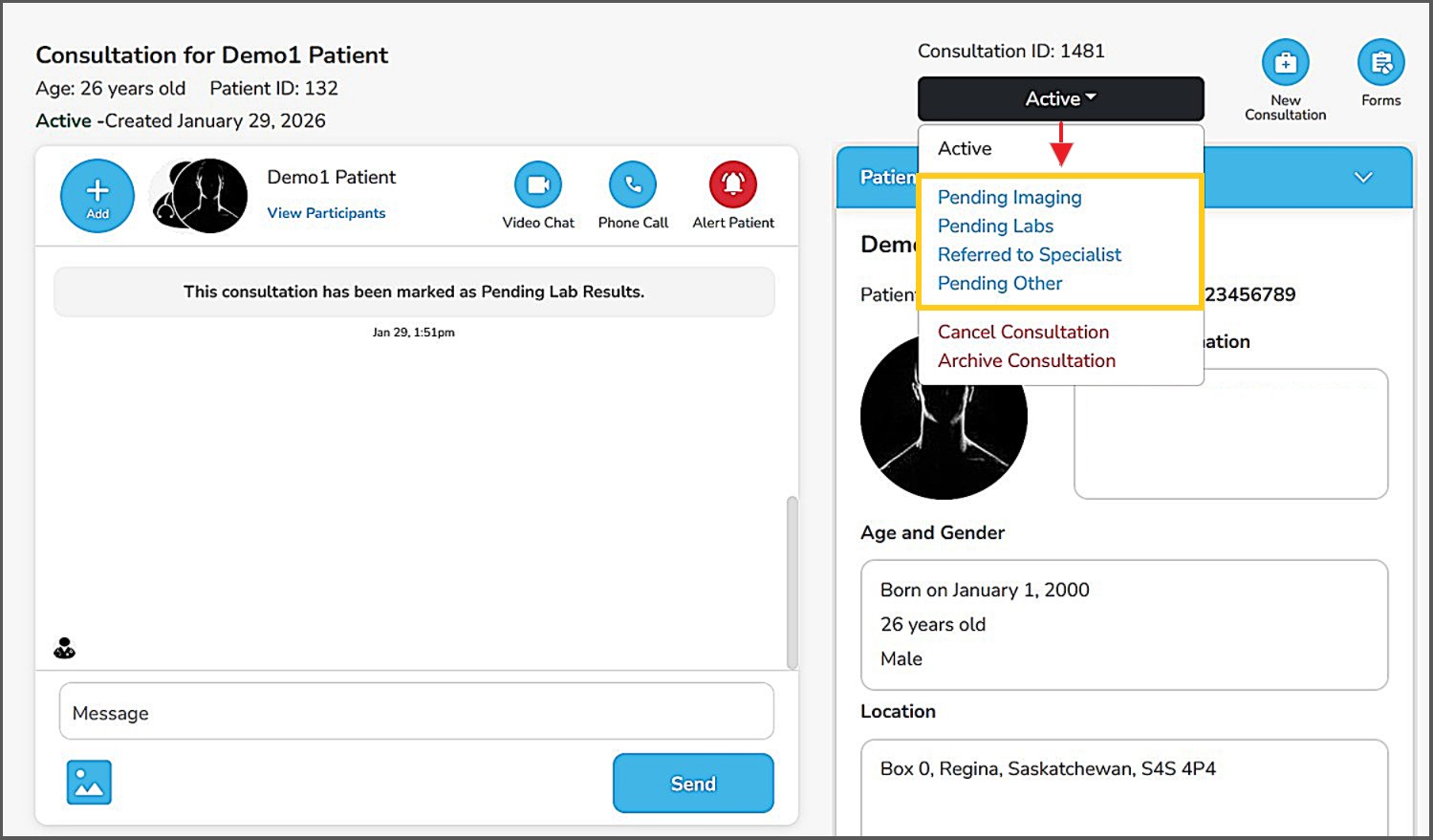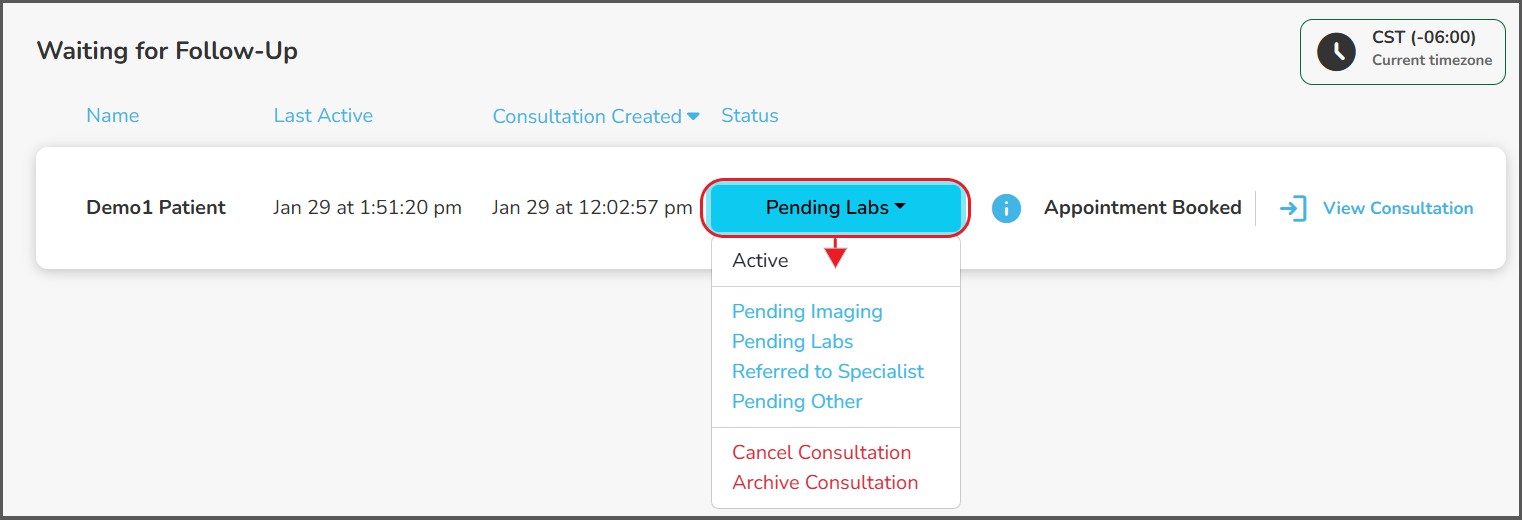 Status changes may be made from either the 'Active and Pending' screen, from within the active patient consultation, or on the 'Waiting for Follow-Up' screen.
