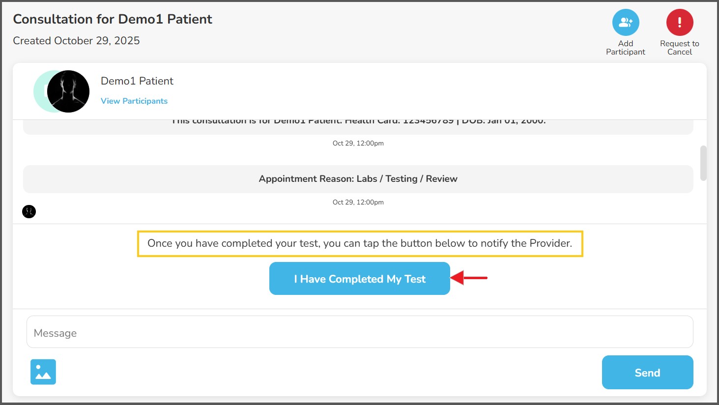 Once they complete the necessary test(s), they may enter the consultation and click 'I Have Completed My Test'. The status will then change to 'Ready to Review'.