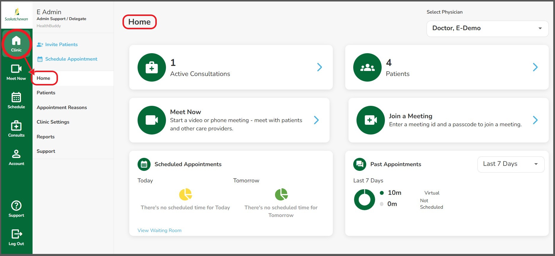 - To return to the 'Home' screen at any time, select 'Clinic' in the dashboard.