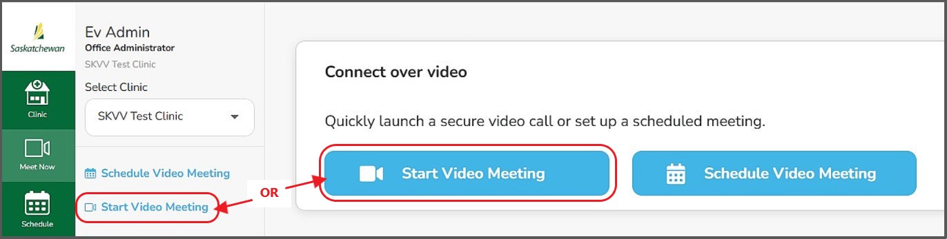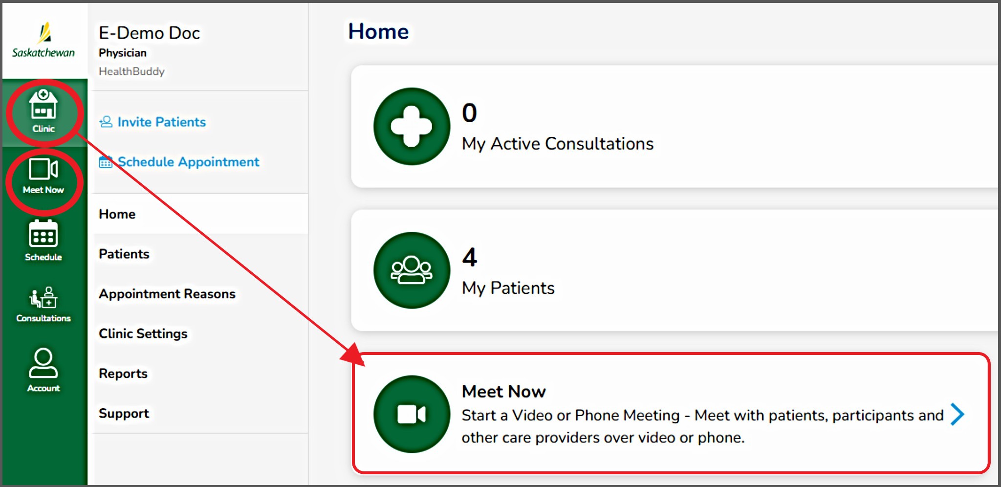 - The 'Clinic' tab, then 'Meet Now', or