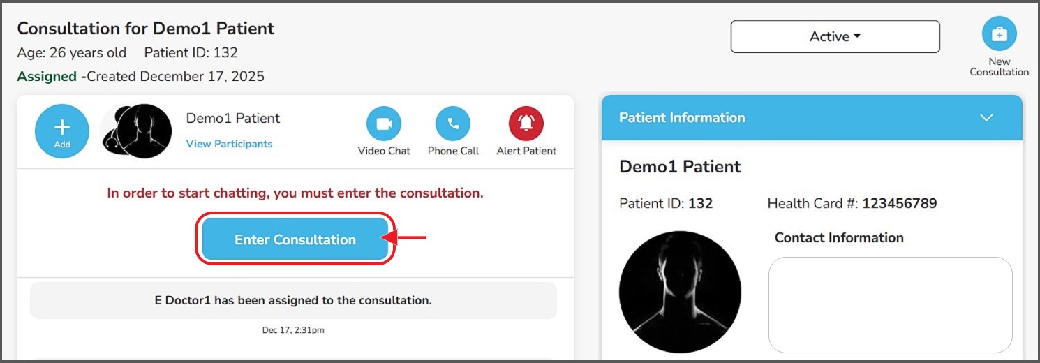 - Click 'Enter Consultation' at the top of the chat area when you are ready to begin.