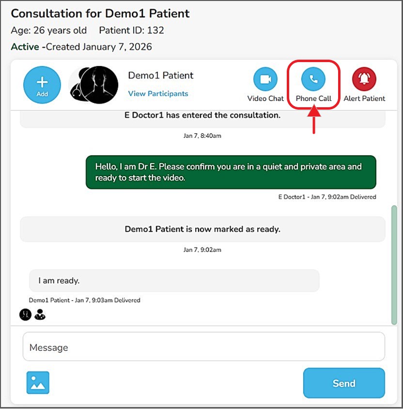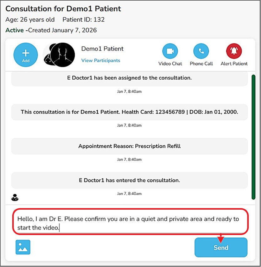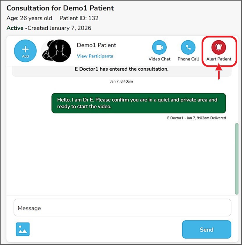 - Providers or their clinic admin may send a quick message to the patient to alert them. This message gets pushed via SMS text or a chat message within the consultation itself.
