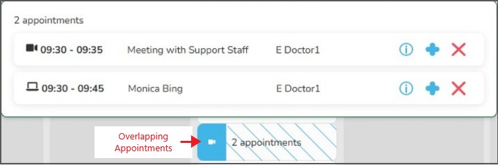 - Overlapping video meetings/consultations will appear in a box with a hashed background