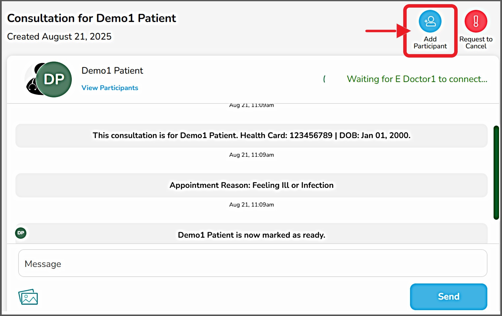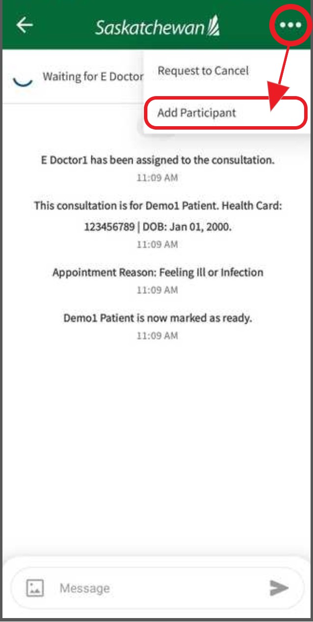 Step 1 - Once you have entered your consultation, message your healthcare provider in the chat, asking them to invite a participant on your behalf.