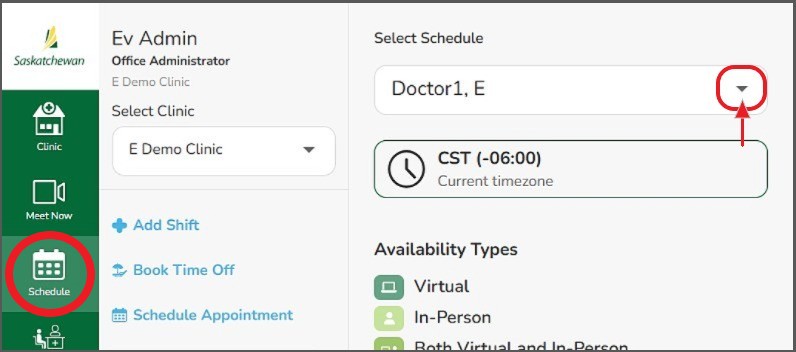 | If you are in the 'Schedule' tab and are the clinic admin, click the 'Select Schedule' drop-down to choose the provider whom you are scheduling for. |