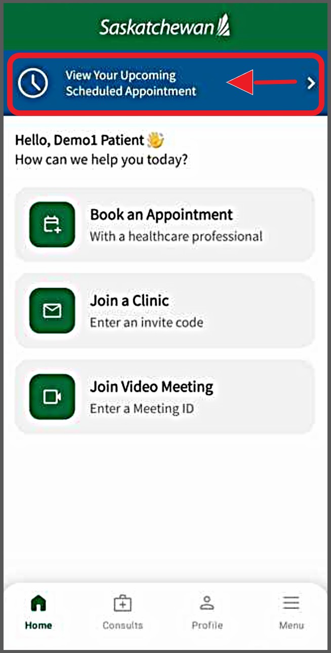 At the top of the ‘Home’ screen, tap ‘View Your Upcoming Scheduled Appointment’. This message appears for today's appointment(s) only.
