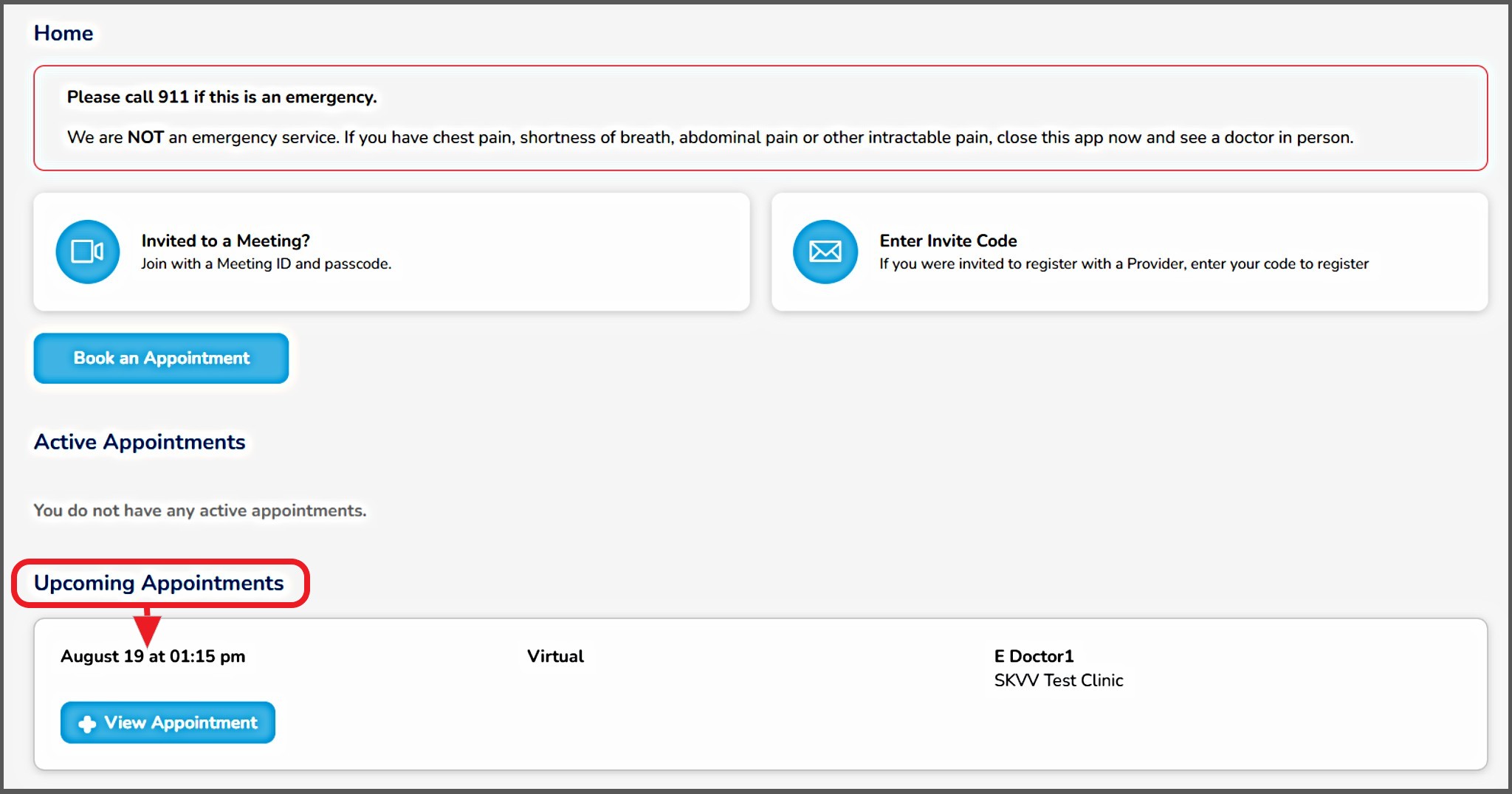 On the ‘Home’ screen, find and tap on your appointment under ‘Upcoming Appointments’ or ‘Active Appointments’.