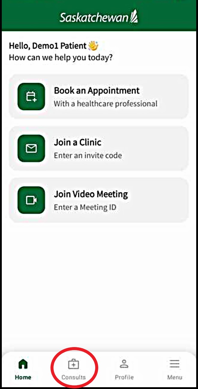 Step 1 - While on the ‘Home’ screen, select 'Consults/Consultations'.