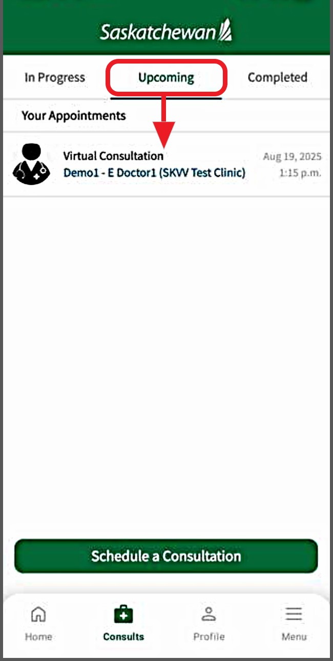 On the bottom navigation bar, tap Consults > Upcoming > then on appointment
