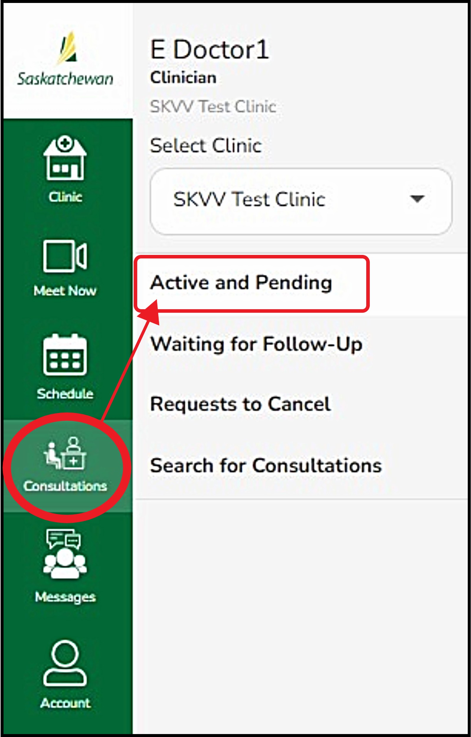 Step 1 - Select 'Consultations' from the left navigation bar, then click 'Active and Pending'.