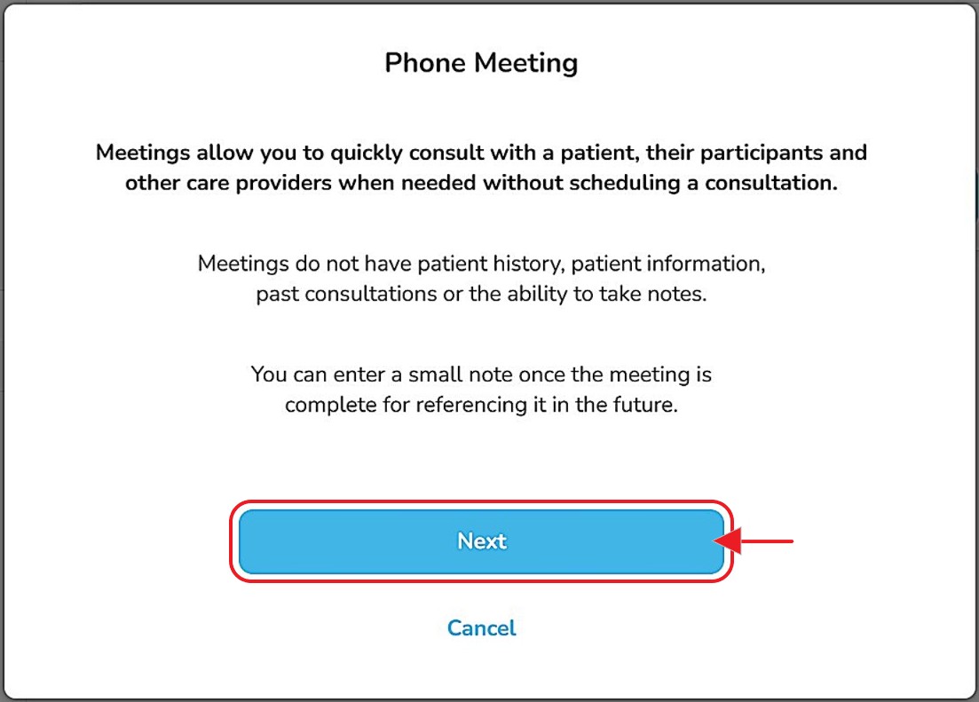 Step 2 - Review the information on the 'Phone Meeting' screen, then click 'Next'.