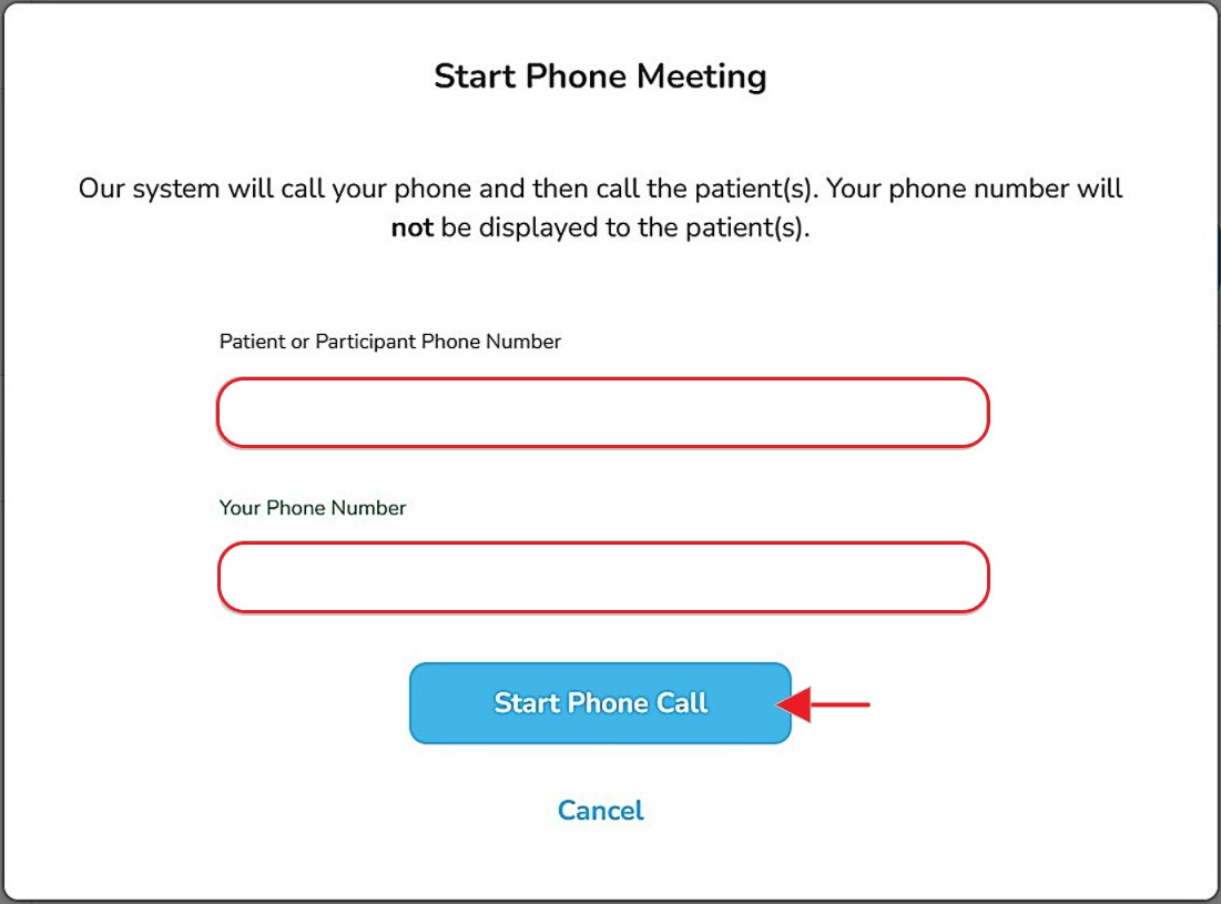 Step 3 - Enter the participant's phone number, your landline or cell phone number (your number remains hidden), then click 'Start Phone Call'.