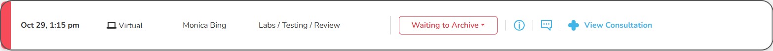 - Completed consultations that are marked as 'Archived' (red). Archived consults will remain here for approximately 3 hours, then will drop from this screen and move to 'Consultations > Completed'.