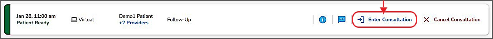 When you initially enter the patient consultation, the patient will not realize you are there until you click 'Enter Consultation' at the top of the chat area. This gives you a chance to review the consult info ahead of time, as well as leave the consult and return later.