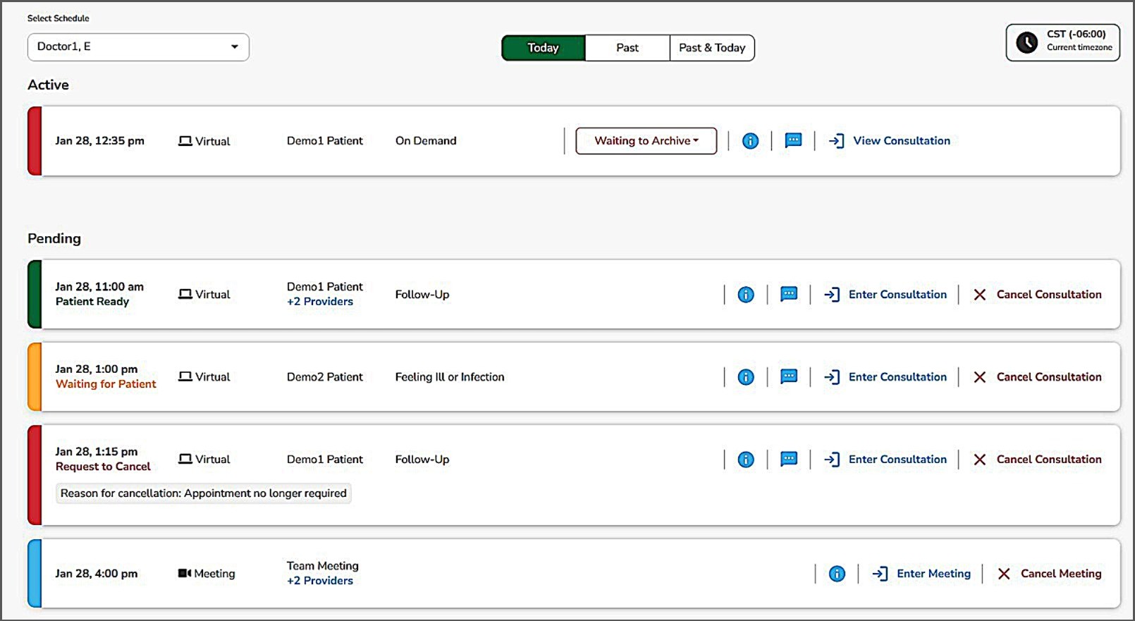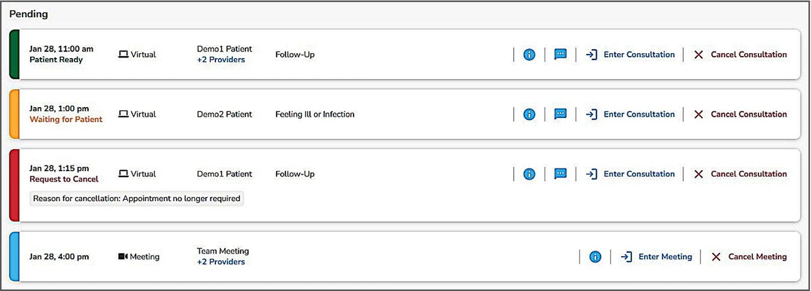 As soon as patient consultations or meetings are entered by the host provider or others from their clinic, the appointment automatically moves from the 'Pending' section to the 'Active' section. They include: