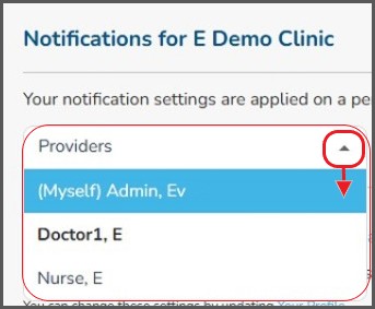 - Clinic admins configure notifications for the providers they want to receive alerts for. They must first select the provider's name from the dropdown.