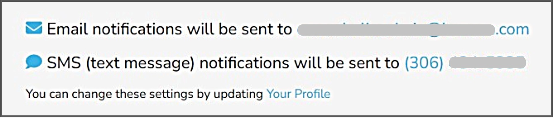 - Notifications will be sent to the email address and mobile number noted at the top of the screen. This information is pulled from the account holder’s 'Profile Information'.
