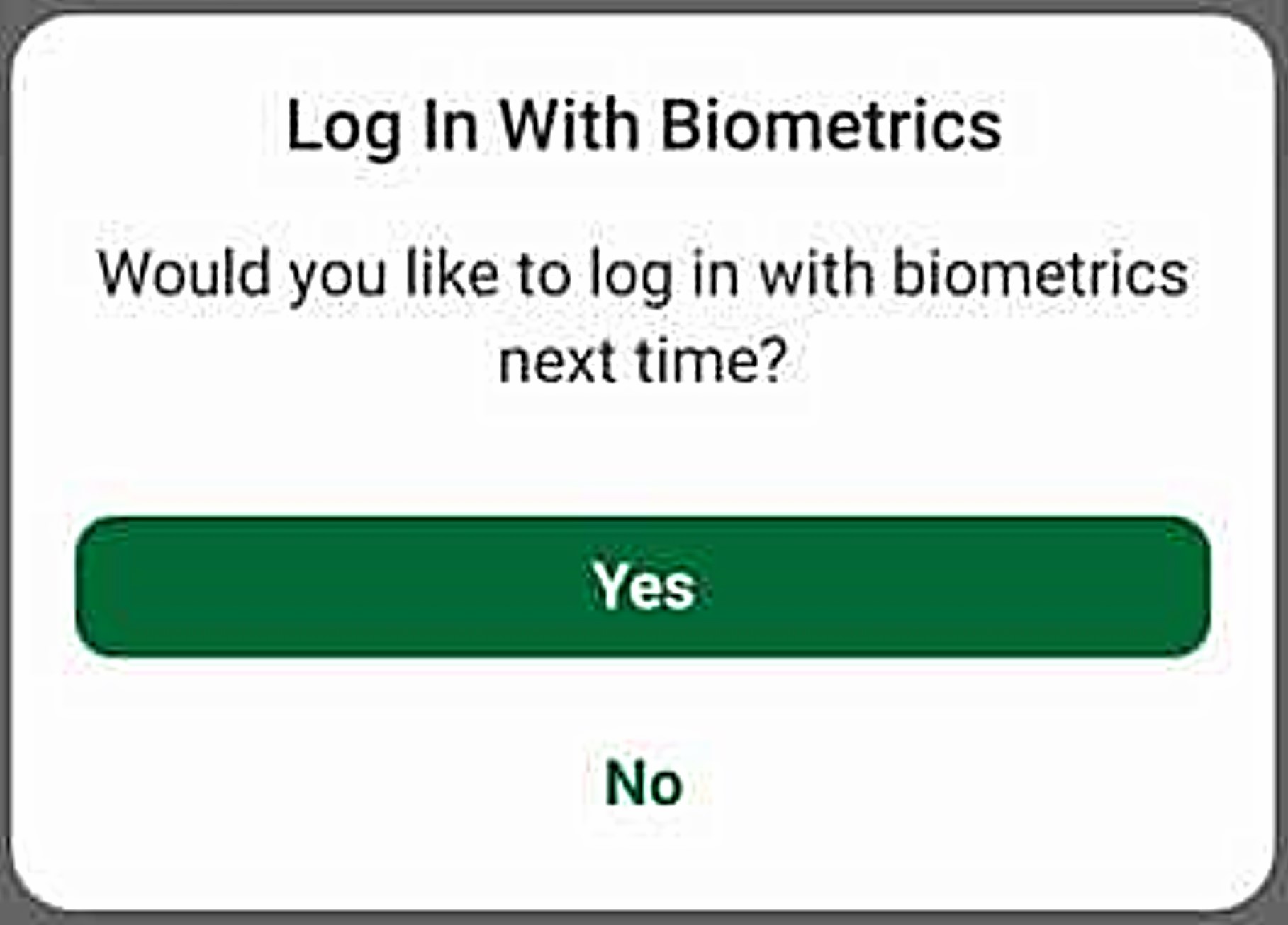 Step 5 - You will be asked if you would like to enroll in biometrics. Select 'Yes' or 'No'. See article - Adding Biometrics to the Login Process on a Mobile Device