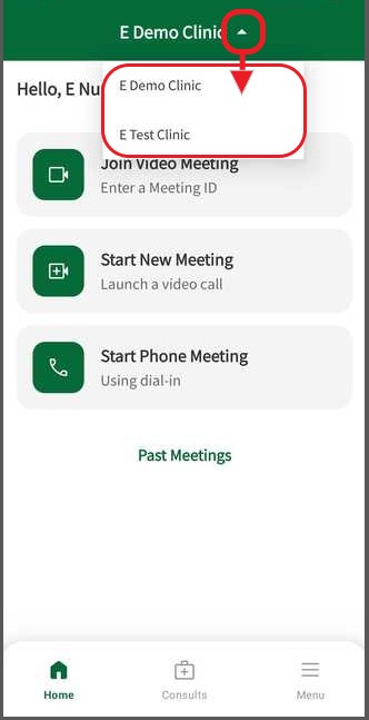 Click the drop-down arrow beside the clinic name at the top of the 'Home' screen, then choose your clinic.