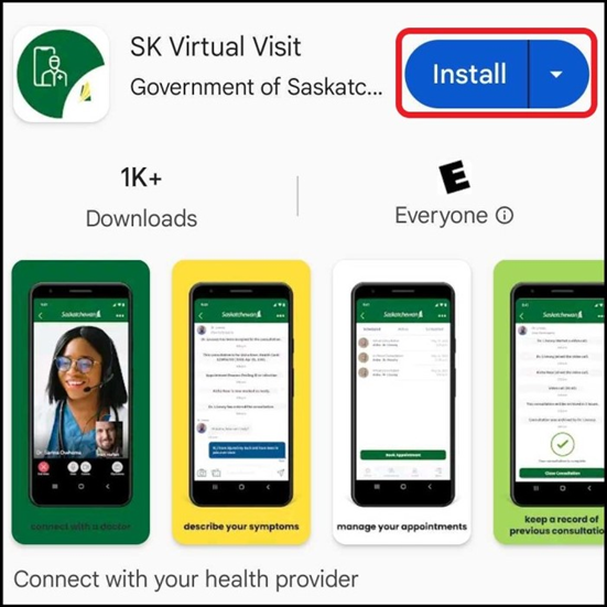 Step 1 - Go to either the Apple App Store or Google Play store, search for 'SK Virtual Visit' and Download/Install: