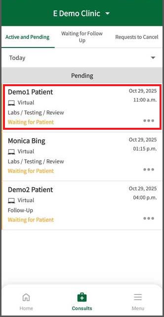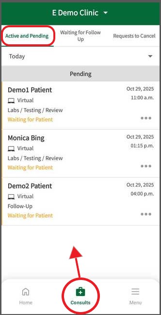 Step 1 - On the bottom of the ‘Home’ screen, click 'Consults'. You will be directed to the ‘Active and Pending’ screen: