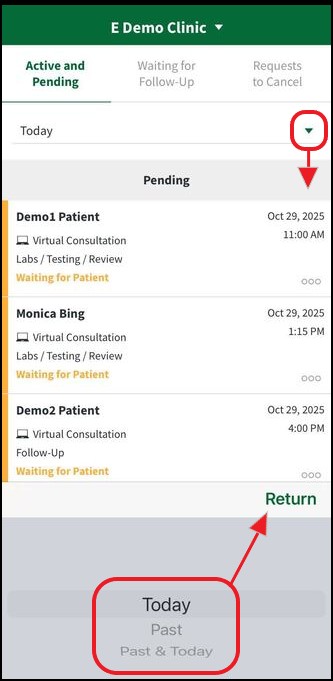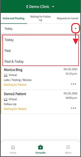 Step 2 - You have the options to see scheduled consults for 'Past & Today', 'Today', or ‘Past' by clicking the drop-down arrow near the top of the screen.