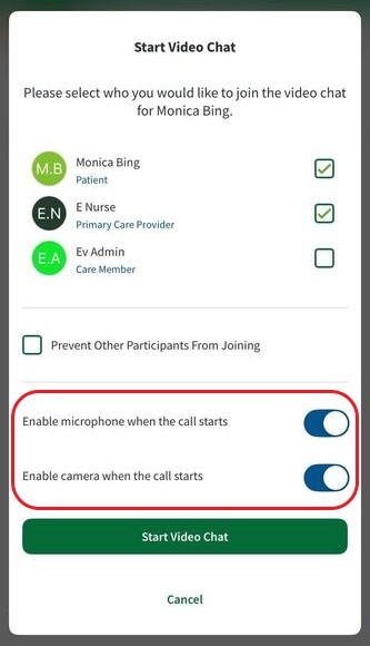- Camera/microphone permissions - Toggle to enable your microphone and camera for this video session.