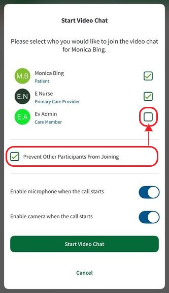 - 'Prevent Other Consultation Participants From Joining' - you may prevent/allow certain participants from joining the video by checking/unchecking this box and checking/unchecking their name. Checking this box will also prevent anyone who was sent the video URL information from joining the video. See the examples below, where a Clinic Admin has been invited into this consultation.